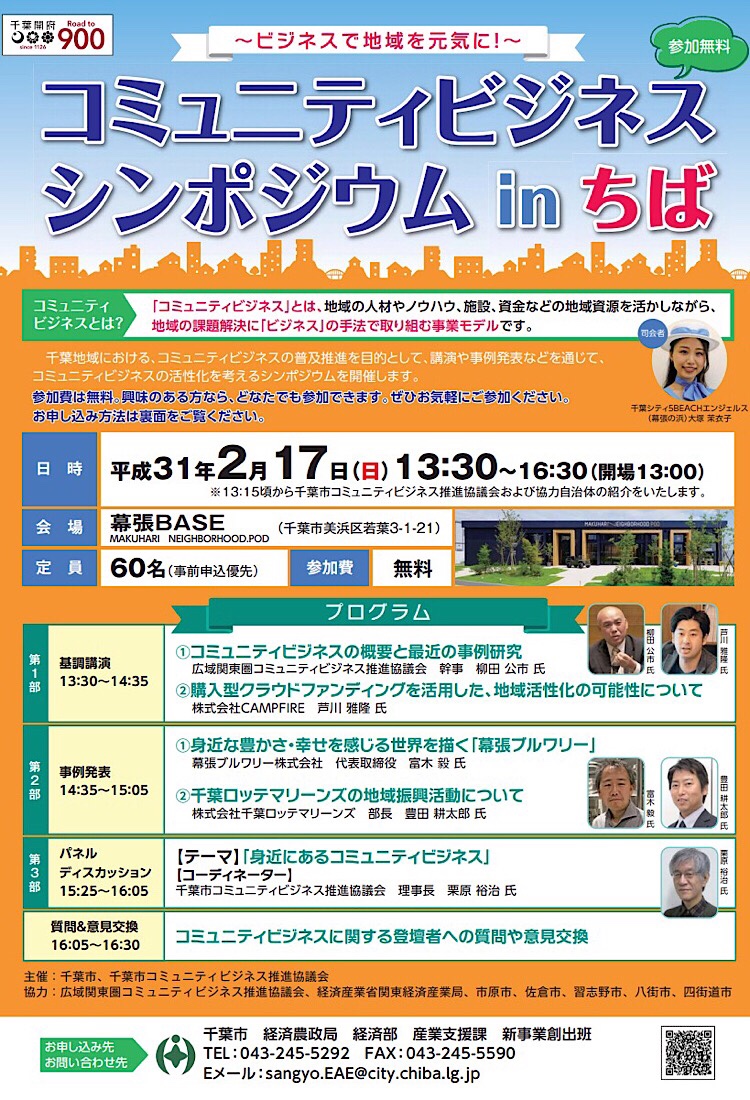 2019年2月17日(日)幕張BASEにて、千葉市、千葉市コミュニティビジネス推進協議会主催「コミュニティビジネスシンポジウム in 千葉」が開催されましたのでご紹介させていただきます。